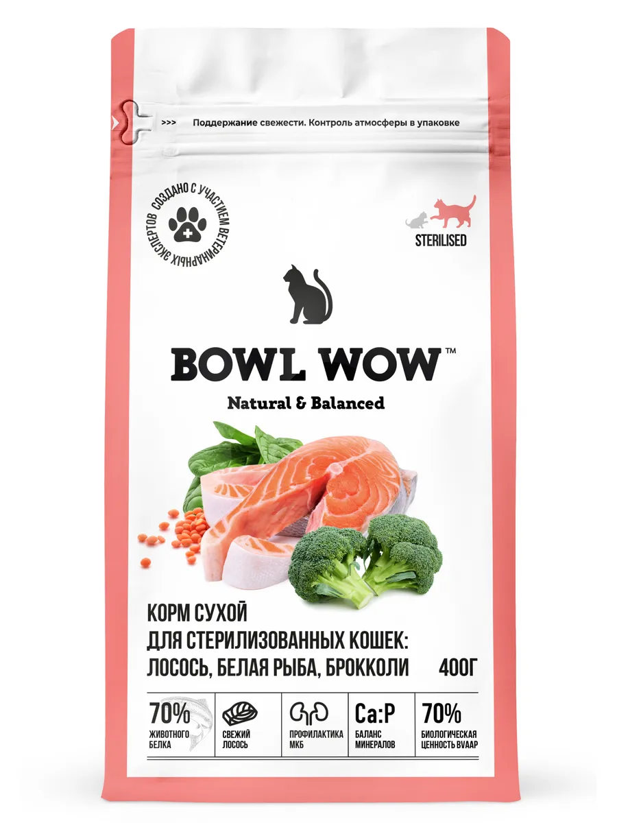 Полнорационный корм BOWL WOW с лососем, белой рыбой океанических пород и добавлением брокколи — это тщательно сбалансированная формула со свежим сочным лососем первого сорта и оптимальным энергетическим профилем.Свежие рыбные ингредиенты делают корм более вкусным и привлекательным для питомцев. Для поддержки здоровья стерилизованных животных мы разработали уникальный комплекс Eo Sterilised, который включает в себя клюкву, бруснику, DL-метионин, L-карнитин и растительную клетчатку. Комплекс нацелен на профилактику образования камней в мочевыводящих путях, правильное функционирование желудочно-кишечного тракта и поддержку здорового веса стерилизованного любимца. Размер гранул 8 мм идеально подходит для взрослых кошек.